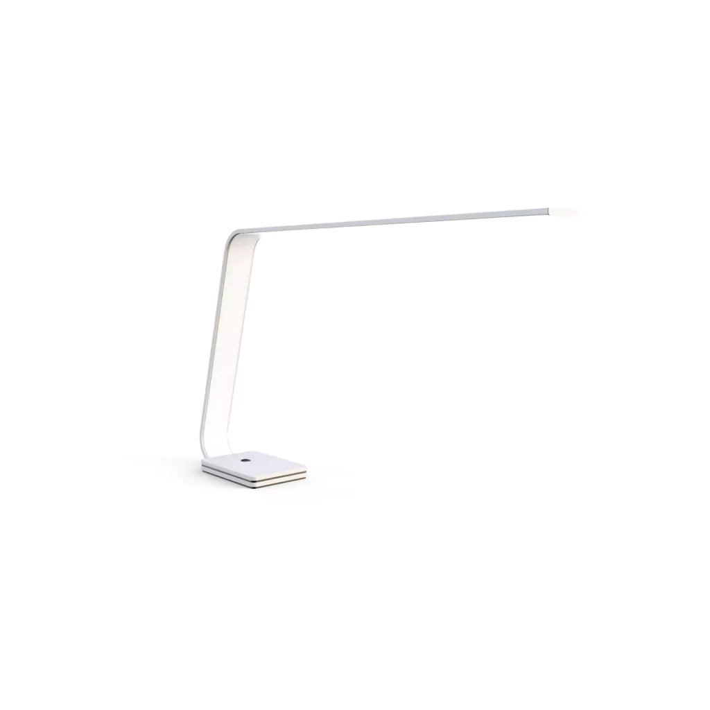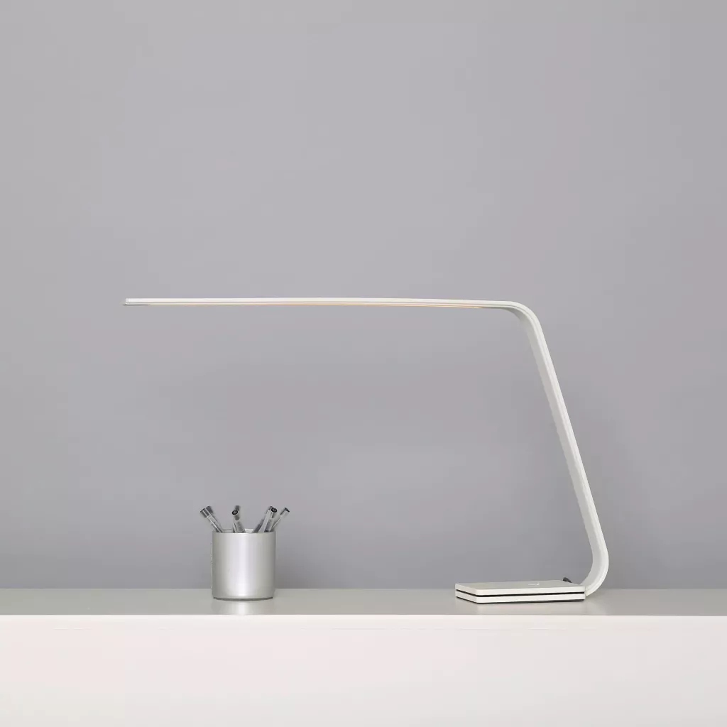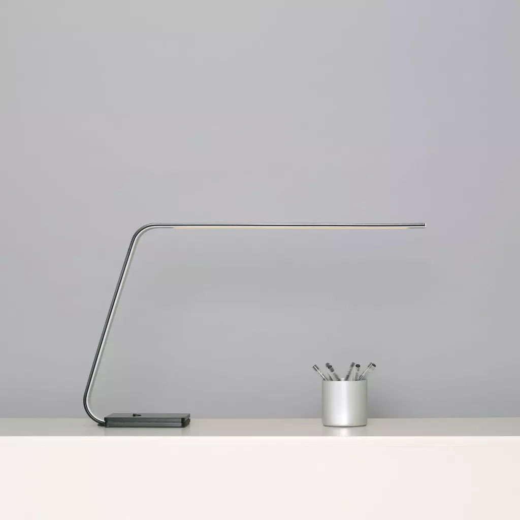 La lámpara de escritorio Tokio se materializa a partir de un perfil de aluminio curvado. Gracias a la tecnología LED ultra delgada, toda la lámpara se resuelve en una fina lámina metálica y adquiere una forma especialmente sintética.